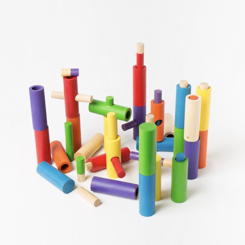 Consiste en un total de 56 piezas de madera al natural y teñida en 6 colores diferentes.