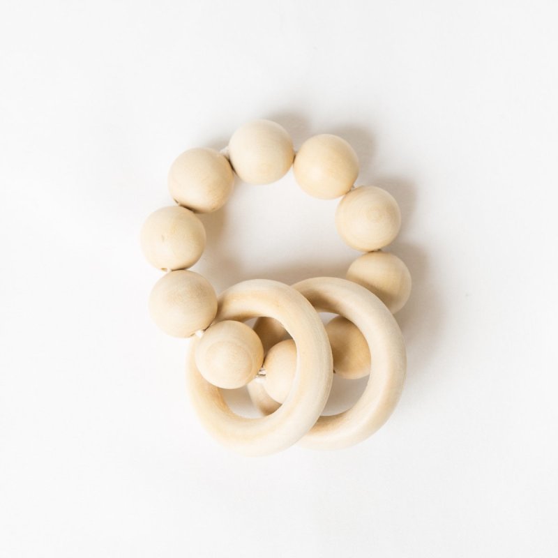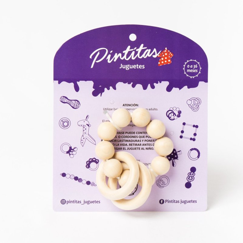 La forma circular de las argollas desafían la prensión La diversidad de texturas dada por la combinación de la madera junto al lazo son una fuente de aprendizaje. La sonaja emite sonido cuando es sacudida o golpeada por el bebé. El diseño de la sonaja permite que sea comprensible la relación de causa – efecto, acción — resultado, es decir al sacudir — produzco y escucho el sonido. El tiempo de exploración y juego varía según interés y curiosidad de cada bebé y también incide la relación fuerza que debe hacer el bebé y el peso de la sonaja,